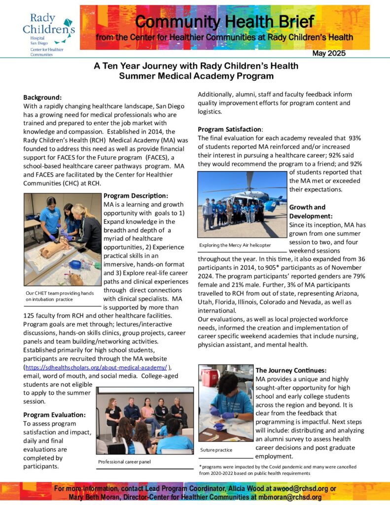 Founded in 2014 under the Rady Children’s Center for Healthier Communities Youth Development priority area, SMA was established and continues to serve as a fundraiser for CHC’s FACES for the Future-San Diego program. FACES is a school based comprehensive health careers pathway program that prepares socio-economically diverse high school students in City Heights for careers that offer livable wages and upward mobility. SMA was established in collaboration the UC San Diego School of Medicine. Over the years, the program has grown from 36 applicants/enrolled students in 2014, to a total of 559 alumni inclusive of all Medical Academy programs in 2024. As a result of student and community interest, the Medical Academy expanded to enable high school students throughout the San Diego region and beyond to participate in once-in-a-lifetime programs. Learn more about Rady Children’s Center for Healthier Communities here.
